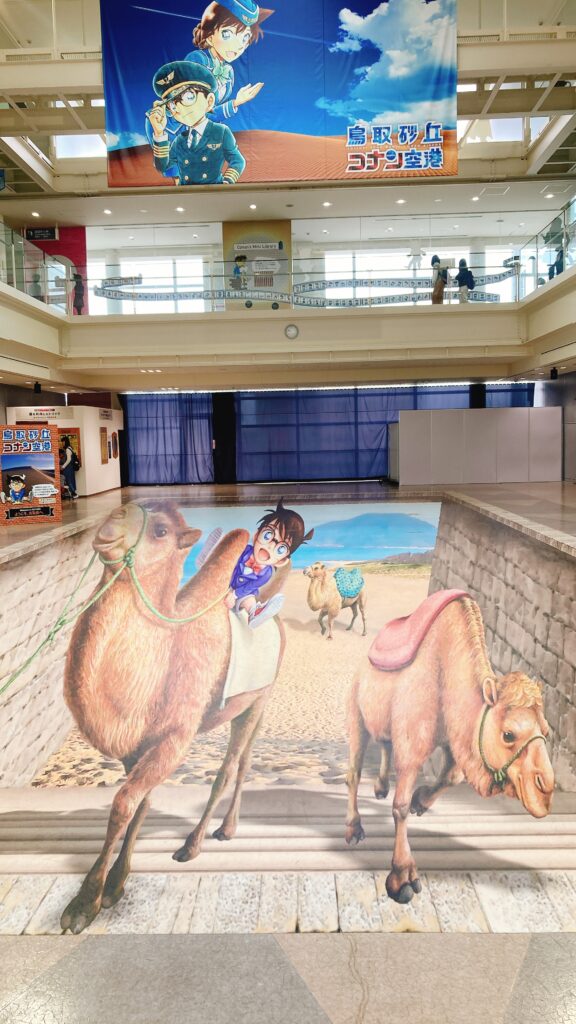 空港内でもひときわ目立つのですぐ分かる。ラクダに乗ったコナン君と写真が撮れるので鳥取県らしさとコナン君両方を楽しめる。トリックアートは上から誰かに撮影してもらった後に画像をトリミングすると良い感じになる。